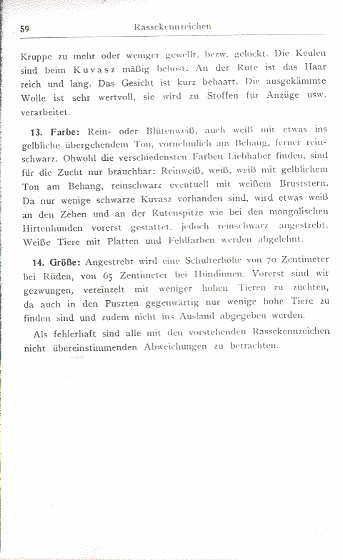 Am 31. Mai 1929 erschien das erste deutsche Zuchtbuch des KO.K. für Komondore, Kuvasz und Pulis, das zwischen Komondor und Kuvasz streng unterschied. Dies war auch der Grund, warum dieses Zuchtbuch als das "erste Zuchtbuch" vorgestellt wurde, obwohl eine erste Version bereits 1924 veröffentlicht worden war (vgl. das Zuchtbuch des Deutschen Kartells für Hundewesen (DKH.) E.V. I. Band der Abteilung Komondore, Kuvasz (ungarische Hirtenhunde), Pulis (ungarische Schäferhunde) des Komondor-Klub (KO.K.), Stand am 31. Mai 1929, Gauting bei München, Vorwort, S. 5 - 6.) Einen FCI-Standard gab es zu diesem Zeitpunkt noch nicht, wohl aber enthielt das Zuchtbuch eine Darstellung der "Rassekennzeichen" für die einzelnen Rassen. Spektakulär aus heutiger Perspektive: Neben den Farben "Rein- oder Blütenweiß" und "weiß mit etwas ins gelbliche übergehendem Ton, vornehmlich am Behang" wurde in den Rassekennzeichen auch "reinschwarz" als Farbschlag benannt: "Da nur wenige schwarze Kuvasz vorhanden sind, wird etwas weiß an den Zehen und an der Rutenspitze wie bei den mongolilschen Hirtenhunden vorerst gestattet, jedoch reinschwarz angestrebt." (Ebda, S. 59). Kaum minder interessant ist die Tatsache, daß für Rüden eine Schulterhöhe von "nur" 70 cm angestrebt wurde, für Hündinnen waren 65 cm erwünscht, und dies mit der weiteren Einschränkung, daß man vorerst "vereinzelt mit weniger hohen Tieren" züchten müsse, "da auch in den Puszten gegenwärtig nur wenig hohe Tiere zu finden sind und zudem nicht ins Ausland abgegeben werden" (ebda, S. 59). Die für den Kuvasz angestrebte Größe stimmte damit exakt überein mit der Schulterhöhe, die auch für den Komondor erwünscht wurde, auch für den Komondor wurde eine überraschend große Variation möglicher Farbschläge aufgeführt (ebda, S. 21).