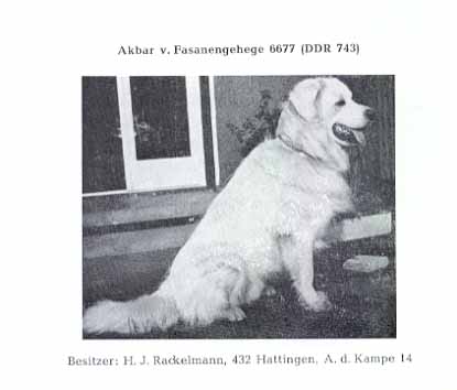 Akba v. Fasanengehege, gew. 4.10.1966 (Photo: Klubzeitung KfuH, Nov./Dez. 1968, Nr. 128, S. 0). Akba hatte einen stark ausgeprägten Stop, so daß auch bei ihm der Kopfschnitt an einen Retriever erinnert, seine Ohren sind deutlich zu hoch angesetzt. Auf der Bundessieger-Zuchtschau Frankfurt/Main, 14./15. September 1968, wurde er "SG II" bewertet, wobei die Minuspunkte sich hauptsächlich auf den schweren Kopf und die damit verbundene Neigung zu "Hängelefzen" bezogen (Richterbericht, Klubzeitung Klub für Ungar. Hirtenhunde E.V., Nov./Dez. 1968, Nr. 128, S. 14). |
