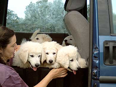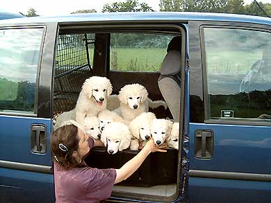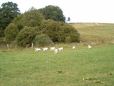 Bald sind wir 11 Wochen alt und schon ganz richtig erwachsen, ehrlich! Deshalb dürfen wir auch schon Auto fahren wie die Großen und draußen auf der grünen Wiese toben. Aufregend ist das schon, aber Angst kennen wir keine! So ein Tapetenwechsel ist eine tolle Sache, da kann man doch mal anderswo das Gras unsicher machen. Und wenn wir uns alle gleichzeitig in Bewegung setzen, dann werden Herrchen und Frauchen so richtig flott. Spassig, wirklich, wenn sie auf ihren zwei Beinen hinter uns her düsen... So ein Allrad-Antrieb ist da schon eine echte Weiterentwicklung, damit kann man es weit bringen ;-) Nun ja, anders als wir, wissen die Kleinen es noch nicht, aber bald geht es tatsächlich auf in die weite Welt. Langsam naht jetzt die schwere Zeit der Trennungen, als Züchter wissen wir das. Trotzdem ist es immer wieder schwer. |