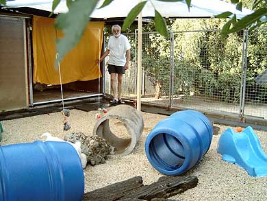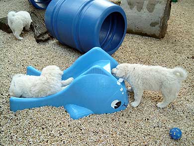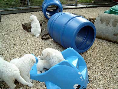 Diese Woche war es unglaublich warm, mit dem heißesten Tag in Deutschland seit Anbeginn der Temperaturmessungen und nicht zum Aushalten, nicht einmal in den schattigen Gartenecken. Überall stehen jetzt Abdeckungen und Sonnensegel, und die Hundemutter kommt regelmäßig mit dem Gartenschlauch und macht alles feucht und kühl. Trotzdem, richtig spielen kann man nur am frühen Morgen oder gegen Abend, wenn es ganz allmählich etwas schattiger wird. Dann wird nachgeholt, was am Tag versäumt wurde. Aufgrund der Hitze gehören Ziegenmilch und Hüttenkäse in diesen Tagen zu den bevorzugten Mahlzeiten. Natürlich gibt es längst schon Welpenbrei, aber für ein gutes Schlückchen geht man auch gern noch zu Mutter Quillaja. Mit vorgewürgtem Futter trägt Quillaja auch zu den "festen" Mahlzeiten bei. Vor unserem T-Wurf haben wir natürlich schon eine Reihe unterschiedlicher Würfe erlebt. Quillajas Welpen sind noch verschmuster, als wir es bislang schon gewöhnt waren - lauter superliebe Kinder, die immer wieder Kuscheln, Schmusen und auf den Schoß möchten. Zu unserer Freude holt auch der Benjamin der Truppe, der kleine "Idefix", zunehmend auf - unser Idefix ist ein sehr helles Köpfchen und besonders pfiffiges Kerlchen, das in Sachen Lebhaftigkeit von Anfang an mit seinem größten Bruder wetteiferte! |