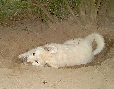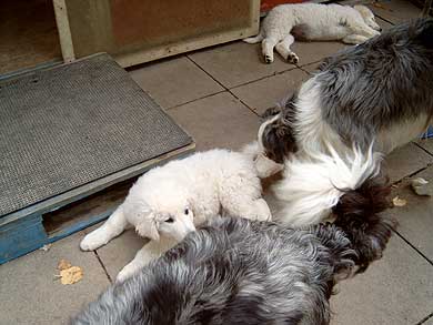 Aufruhr im "Welpenstall": Besuch der Borders von nebenan... Nicht alle Hunde sind klein und weiß, wie die Geschwister, oder groß und weiß, wie Mama, Onkel und Tanten. Na, das ist doch mal eine gelungene Überraschung, wer hätte das gedacht...? Aber ganz im Ernst: Kuvasz-Kinder sollten frühzeitig lernen, daß nicht alle Hunde aussehen wie die eigene Familie, sondern auch scheckig oder dunkel sein können, klein oder mittelgroß oder sogar größer als die Verwandschaft, und daß sie sich manchmal auch ganz anders verhalten. |
