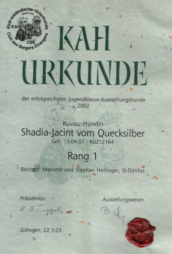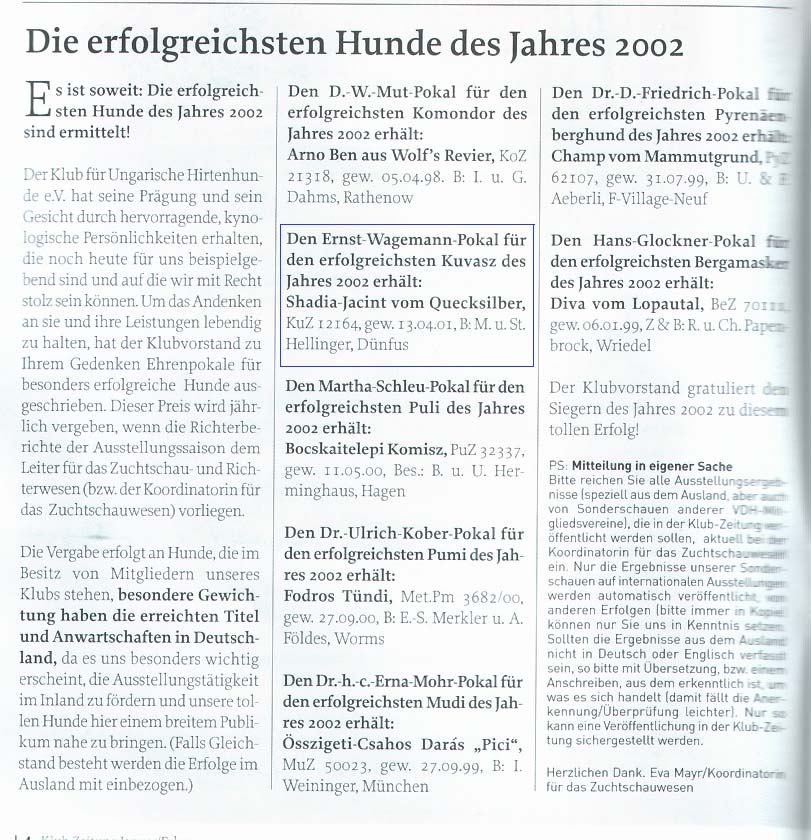Shadia-Jacínt vom Quecksilber wurde zum erfolgreichsten Kuvasz 2002 gewählt und erhielt den Ernst Wagemann-Pokal (nachzulesen in der Klubzeitung des KfuH Januar/Februar 2003). Nur gut, daß auch die intelligentesten Kuvaszok noch nicht lesen könnten, übermütige Flausen hat unser jugendlicher Vorwitzling schon genügend im Kopf :) Gewertet werden für diese Wahl alle in diesem Jahr erreichten Ausstellungsergebnisse eines Hundes, schwerpunktmäßig aber die im Inland errungenen Titel. Ein Hund, der ausschließlich im Ausland auf Ausstellungen war, kann an der Wahl deshalb nicht teilnehmen.