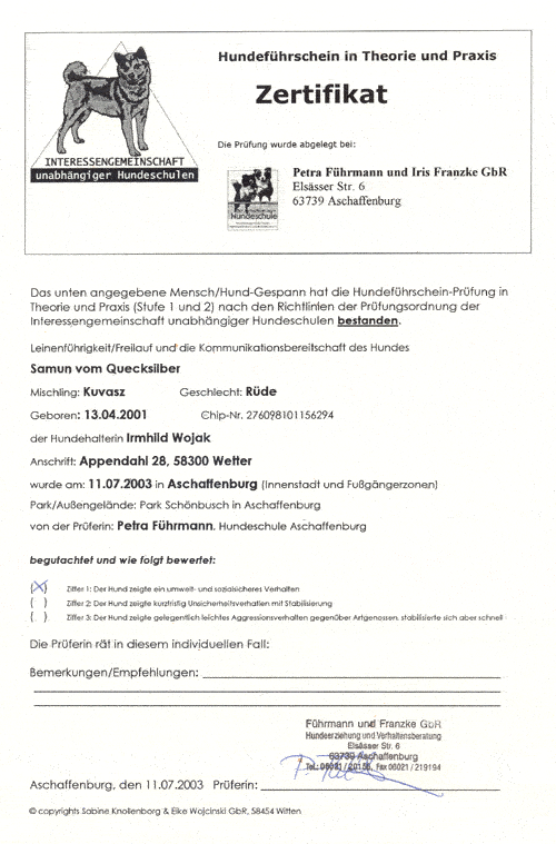 Samun vom Quecksilber hat seinen Urlaub 2003 in Aschaffenburg verbracht, und bei dieser Gelegenheit nicht nur die bayrischen Wälder kennengelernt, sondern auch die Hundeschule Aschaffenburg von Petra Führmann und Iris Franzke besucht. U.a. hat er bei dieser Gelegenheit zusammen mit Frauchen die Hundeführschein-Prüfung der Interessengemeinschaft unabhängiger Hundeschulen absolviert und bestanden. Die Aschaffenburger Hundeschule hat einiges mehr im Angebot - wenn Sie's genauer wissen möchten, schauen Sie doch mal auf der Website vorbei!
