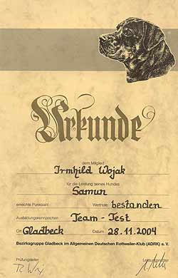 Teamtest, Samun vom Quecksilber Samun vom Quecksilber und sein kleiner Dackel-Mix-Lebensbegleiter Moritz haben am 28. November 2004 mit ihrer Besitzerin Irmhild Wojak beim Allgemeinen Deutschen Rottweiler-Klub den Teamtest absolviert. Alle drei haben die Prüfung bestanden ;-) Irmhild und Samun haben 2003 bereits gemeinsam den Hundeführschein der Interessengemeinschaft unabhängiger Hundeschulen in der Aschaffenburger Hundeschule bei Petra Führmann und Iris Franzke absolviert (siehe Aktuelles 2003). "Der Team-Test wurde im Südwestdeutschen Hundesportverband (swhv) entwickelt und nach seiner erfolgreichen Einführung in einer für alle Hundehalter schwierigen Zeit von den Mitgliedsverbänden des Deutschen Hundesportverbandes (dhv) als Angebot für alle daran interessierten übernommen. Flächendeckend in ganz Deutschland bieten die dhv Mitgliedsverbände und deren Ortsvereine heute Team als Basisausbildung und Einstieg in den Hundesport an." Weitere Informationen finden Sie hier. Internationale Rassehundeschau Friedrichshafen, 4. Oktober 2004 Unser Tavasz-Omar wurde in Friedrichshafen Bodensee-Jugend-Sieger ( Sg1; Jugend-CAC (VDH) und Jugend-CAC(KfUH)). Am gleichen Tag wurde unsere Tifarah mit Sg 2 bewertet! ****************************Welpenplanung Shadia, 2004 Schlechte Nachrichten für uns und für alle, die sich für Welpen von Shadia interessiert haben. Shadia war nicht trächtig. Auch erfahrene Züchter können sich täuschen, leider. Welpenplanung, 27. September 2004 Seit Sonntag zeigt Shadia alle Anzeichen: Die Zitzen werden gößer und rosig, der Brustkorb ist sehr viel breiter geworden, und nun wird sie auch hinter den Rippen breit! Auch wenn wir kein Ultraschall gemacht haben, sind wir uns deshalb sicher: Shadia ist trächtig ist! Und wir freuen uns wahnsinnig... :-)))) Deckmeldung, 20. August 2004 Letzte Woche waren wir auf Besuch in Ungarn: Am 20. August 2004 ist unsere Shadia-Jácint vom Quecksilber, Welt-Jugendsiegerin, Luxemburgischer Jugend-Champion, FCI-Europasiegerin, Luxemburgischer Champion, Bundessiegerin, Amsterdam Winner und Deutscher Champion VDH und KfUH, HD-B, von dem ungarischen Champion Birókerti Boglya, HD-B, gedeckt worden! "Bogi" hat in Ungarn so etwas wie eine Begleithunde-Prüfung. Er hat seine Leistungen mehrmals wettkampfmäßig bestätigt und viele Pokale errungen. Birókerti Boglya ist ein sehr wesensfester, ausgeglichener Hund - ein großer "Schmuser" und das auch bei eigentlich wildfremden Leuten wie mir! ****************************Tamaris zurück in Dünfus Tamaris ist seit dem 6. September 2004 wieder zurück in Dünfus. Die Trennung fiel ihnen nicht leicht, aber durch schwerwiegende private Probleme konnte Tamaris' Familie sich nicht mehr entsprechend um "Tammy" kümmern. Wir haben sie deshalb aus Schweden zurück nach Hause geholt. Das Foto zeigt Tammy im Alter von knapp 8 Monaten. GMZ Gaithein, 28./29.August 2004 Tavasz vom Quecksilber wurde auf der Gemeinschaftszuchtschau Gaithein in der Jugendklasse ausgestellt und wurde am Samstag V1, Jugend CAC und BOB, und am Sonntag V1, Jugend CAC bewertet. Eine neue Heimat in Schweden Unser Tigris lebt seit dem 1. Juni 2004 bei Jenny & Mikael Oleander in Borgstena/Schweden. Wir freuen uns sehr, dass er eine schöne neue Heimat und ein liebevolles Zuhause gefunden hat. Internationale Hundeausstellung Kassel, 22. Mai 2004 Tavasz vom Quecksilber wird in der Jugendklasse V1 bewertet. Tavasz wird in Kassel nicht nur bester Junghund, sondern auch bester Rüde und BOB! Internationale Hundeausstellung Budapest, 8. Mai 2004 Tavasz vom Quecksilber wird in Budapest in der Jugendklasse V2 bewertet. Für unseren jungen Champion Tigris vom Quecksilber suchen wir noch ein geeignetes Zuhause! 28. März 2004 Internationale Hundeausstellung Luxemburg, 28. März 2004 Tigris-Omar vom Quecksilber wird im jungen Alter von 9 Monaten und 4 Tagen mit der Formwertnote "Excellent 1" Luxembourg Junior Champion und bester Rüde. Seine erste Ausstellung hat Tigris mit Bravour absolviert: Trotz seiner Jugend siegte er gegen einen oft prämierten Rüden der offenen Klasse und einen Rüden in der Champion Klasse und wurde somit BOS. Der ungarische Richter János Marcze war begeistert. Hätte unser Youngster etwas mehr Ringerfahrung gehabt, so hätte er auf dieser Ausstellung auch das BOB erhalten. Macht nichts, Tigris hat alle Zeit der Welt, um dies nachzuholen. In der Hündinnen Jugendklasse wurde Tifarah-Katjusa vom Quecksilber in Luxemburg mit der Formwertnote Excellent 1 (=V1) Luxembourg Junior Champion. Shadia-Jácint vom Quecksilber wurde in der Championklasse der Hündinnen V1 (CAC/Res. CACIB) gewertet und ist damit Luxembourg Champion.