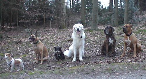 Zu der kunterbunten Kombo, mit der unser Samun vom Quecksilber (Besitzerin: Irmhild Wojak) allwöchentlich mehrfach durch Wälder und Felder streift, gehören von links nach rechts: der kleine Jack-Russel-Rüde Terry, die Malinois-Hündin Farah, Dackel-Mix Moritz (mit dem Samun Garten und Hundedecke teilt), die Fila Brasileiro-Hündin Enni und, last but not least, der Tosa Inu-Rüde Akito.