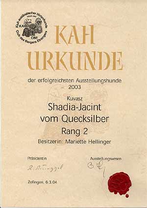 Internationale Hundeausstellung Luxemburg, 28. März 2004 (Championklasse): V1, CAC, Reserve-CACIB. Mit ihren Ausstellungsergebnissen 2003 wird Shadia - erneut - bester Kuvasz des Jahres im KfUH und zweitbester Hund im KAH/Schweiz. Dafür, dass wir Shadia gar nicht so viel ausgestellt haben, hat unser Shadi-Mausi ganz schön viele Titel und Pokale heimgebracht! Amsterdam Winner, 7. Dezember 2003 (Championklasse): V1, CACIB, CAC, Amsterdam Winner und BOB. Internationale Hundeausstellung Hannover, 1. November 2003 (Championklasse): V1, Reserve-CACIB, VDH- und KfUH-Champion-Anwartschaft. Weltausstellung Dortmund, 1. Juni 2003 (Championklasse): V1, Vizeweltsiegerin, Reserve-CACIB, CAC, VDH-Championanwartschaft. Internationale Hundeausstellung Erfurt, 26./27. April 2003 (Championklasse): V1, CACIB, VDH- und KfUH-Champion-Anwartschaft, BOB und Landessiegerin Thüringen. Internationale Hundeausstellung Offenburg, 15./16.März 2003 (Championklasse): V1, CACIB, VDH- und KfuH-Champion-Anwartschaft, BOB und Ortenau-Sieger. Mit Osiris vom Quecksilber belegt Shadia außerdem den 3. Platz in der Paarklasse. Mit den Erfolgen ihres ersten Ausstellungsjahres trat Shadia 2002 in die Fußstapfen ihrer Tante Quillaja und ihrer Großmutter Kátjusá: Sie wurde erfolgreichster Kuvasz 2002 des Klub für Ungarische Hirtenhunde (KfUH) und erfolgreichster Junghund im KAH, dem Klub für ausländische Hirtenhunde in der Schweiz. Darüber haben wir uns natürlich sehr gefreut! Euro Dog Paris, 10. November 2002 (Offene Klasse):