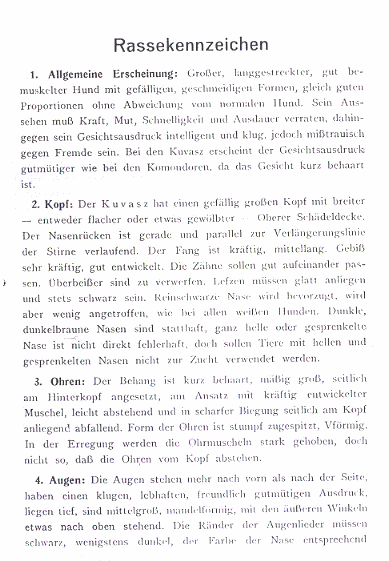 Am 31. Mai 1929 erschien das erste deutsche Zuchtbuch des KO.K. für Komondore, Kuvasz und Pulis, das zwischen Komondor und Kuvasz streng unterschied. Dies war auch der Grund, warum dieses Zuchtbuch als das "erste Zuchtbuch" vorgestellt wurde, obwohl eine erste Version bereits 1924 veröffentlicht worden war (vgl. das Zuchtbuch des Deutschen Kartells für Hundewesen (DKH.) E.V. I. Band der Abteilung Komondore, Kuvasz (ungarische Hirtenhunde), Pulis (ungarische Schäferhunde) des Komondor-Klub (KO.K.), Stand am 31. Mai 1929, Gauting bei München, Vorwort, S. 5 - 6.) Einen FCI-Standard gab es zu diesem Zeitpunkt noch nicht, wohl aber enthielt das Zuchtbuch eine Darstellung der "Rassekennzeichen" für die einzelnen Rassen. Spektakulär aus heutiger Perspektive: Neben den Farben "Rein- oder Blütenweiß" und "weiß mit etwas ins gelbliche übergehendem Ton, vornehmlich am Behang" wurde in den Rassekennzeichen auch "reinschwarz" als Farbschlag benannt: "Da nur wenige schwarze Kuvasz vorhanden sind, wird etwas weiß an den Zehen und an der Rutenspitze wie bei den mongolilschen Hirtenhunden vorerst gestattet, jedoch reinschwarz angestrebt." (Ebda, S. 59). Kaum minder interessant ist die Tatsache, daß für Rüden eine Schulterhöhe von "nur" 70 cm angestrebt wurde, für Hündinnen waren 65 cm erwünscht, und dies mit der weiteren Einschränkung, daß man vorerst "vereinzelt mit weniger hohen Tieren" züchten müsse, "da auch in den Puszten gegenwärtig nur wenig hohe Tiere zu finden sind und zudem nicht ins Ausland abgegeben werden" (ebda, S. 59). Die für den Kuvasz angestrebte Größe stimmte damit exakt überein mit der Schulterhöhe, die auch für den Komondor erwünscht wurde, auch für den Komondor wurde eine überraschend große Variation möglicher Farbschläge aufgeführt (ebda, S. 21).