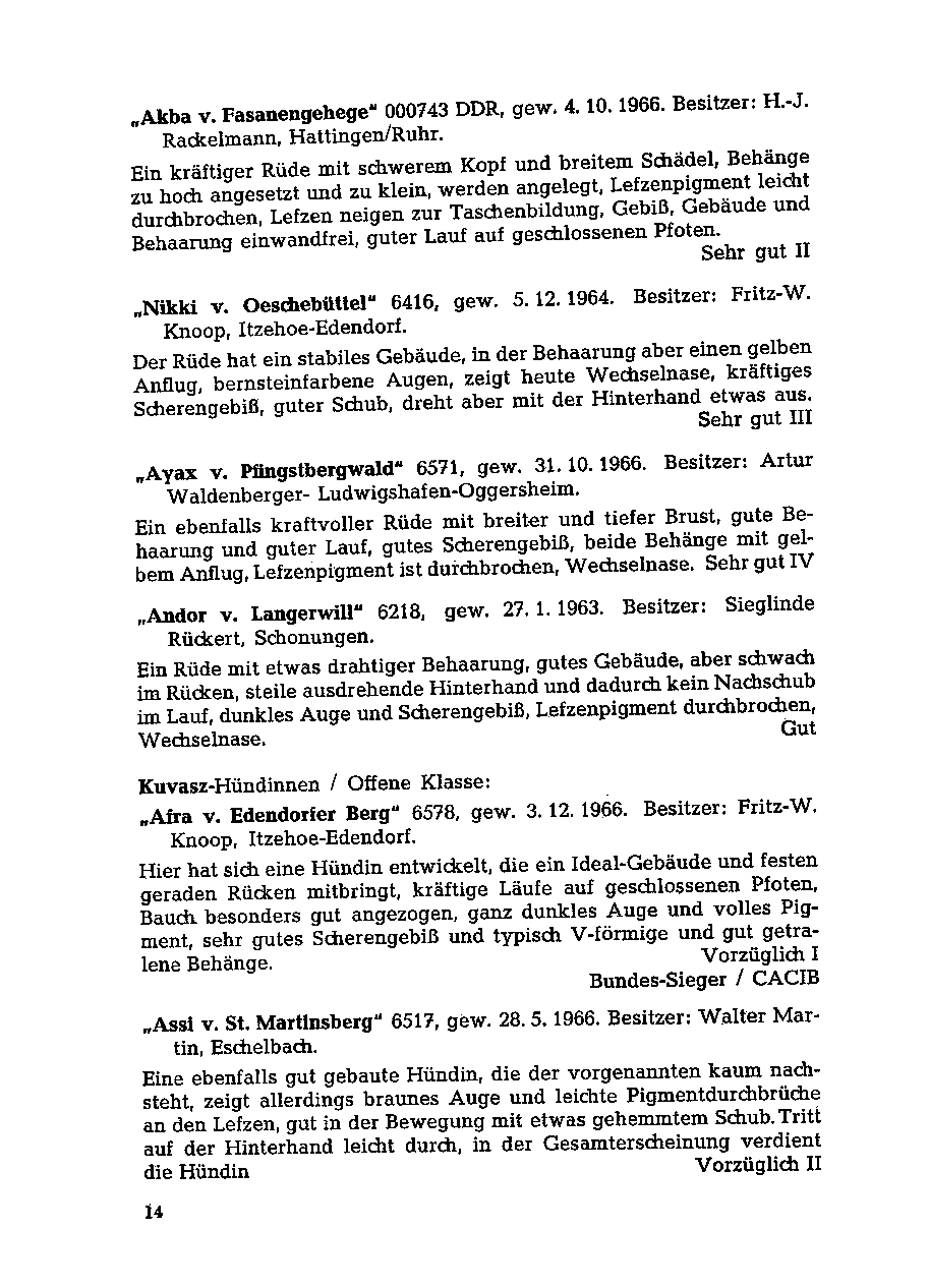 Akba v. Fasanengehege, gew. 4.10.1966 (Photo: Klubzeitung KfuH, Nov./Dez. 1968, Nr. 128, S. 0). Akba hatte einen stark ausgeprägten Stop, so daß auch bei ihm der Kopfschnitt an einen Retriever erinnert, seine Ohren sind deutlich zu hoch angesetzt. Auf der Bundessieger-Zuchtschau Frankfurt/Main, 14./15. September 1968, wurde er "SG II" bewertet, wobei die Minuspunkte sich hauptsächlich auf den schweren Kopf und die damit verbundene Neigung zu "Hängelefzen" bezogen (Richterbericht, Klubzeitung Klub für Ungar. Hirtenhunde E.V., Nov./Dez. 1968, Nr. 128, S. 14). |