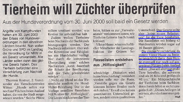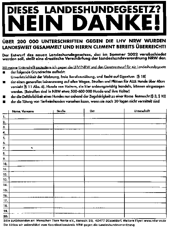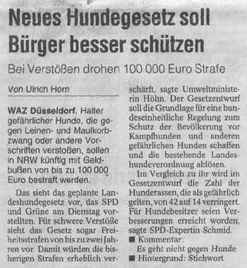 Na, was ist es wohl, was einem Hund jederzeit in ausreichendem Maß zur Verfügung stehen sollte, Kaffee, Tee oder Wasser? Und was geben Sie Ihrem Baby so zum Frühstück? Campari-Orange? Vergebung für die Verbitterung - ein sinnvoller Sachkundenachweis wäre zweifellos ein Gewinn, aber hier reden wir ja angeblich über den Schutz vor gefährlichen Hunden. Um hier vorzubeugen, wären verhaltenskundliche Informationen und Trainings hilfreich, nicht aber Multiple-Choice-Prüfungsfragen nach dem absoluten Basiswissen der Hundehaltung oder Fragen, ob einzelne Rassen laut Landeshundeverordnung nur als "große" Hunde zählen oder unter Liste 2 oder gar 1 und die entsprechenden Restriktionen fallen. Wer zum Sachkundenachweis fährt, der ist sicherlich schon in Kenntnis gesetzt worden, welchen Hund von welcher Liste er an der Leine führt. Welche anderen Rassen sonst unter welche Verordnung fallen, ist ebenso irrelevant, wie es Läufigkeitsdauer und Tragezeit der Hündin für den Rüdenbesitzer sind. Das überzeugendste Ergebnis, das Kampfhunddiskussion, Landeshundeverordnung und Sachkundenachweis bisher erzielt haben, ist die völlige Verunsicherung von Hunden, Hundehaltern und Nicht-Hundehaltern. Inzwischen haben alle Angst. Das ist wirklich schade. Viel Energie und sehr, sehr viel Geld, das in diese Bemühungen geflossen ist, sind sinnlos verpulvert worden. Unbenommen sollten alle notwendigen Rücksichten genommen und Vorsichtsmaßnahmen getroffen werden. Wenn Sie Autofahren, schalten Sie ja nachts auch das Licht ein und schnallen sich an, Sie geben nicht Gas, wenn Sie sehen, daß eine ältere Dame sich anschickt, die Straße zu überqueren - auch wenn da gerade keine Ampel und kein Zebrastreifen ist -, und Sie bitten nicht Ihren 13-jährigen Sohn, doch mal eben das Steuer zu übernehmen. Leider gibt es trotzdem Verkehrsrowdies. Überraschung: Die werden sich durch die Information, daß tägliche neue tödliche Unfälle geschehen, nicht belehren lassen. Auch wenn unsere Hirtenhunde mit dem geplanten neuen Landeshundegesetz nicht mehr auf der "schwarzen" Liste stehen werden - zum Jubeln ist es leider noch viel zu früh. Nicht nur sollen die möglichen Strafen bei Verstößen gegen die Gesetzgebung dramatisch erhöht werden (WAZ, Nummer 72, Dienstag, 26. März 2002), viel schlimmer ist weiterhin in der Diskussion, eine generelle Leinenpflicht einzuführen, von der es keine Befreiung mehr gibt. Die Hunde dürften dann nur noch auf entsprechend eingezäuntem Privatgelände bzw. auf eingefriedeten Hundeplätzen, die von den Gemeinden eingerichtet werden können, aber nicht müssen, frei laufen: "Die einzige Verschärfung, da stimmt Viktor Haase zu, bestehe tatsächlich darin, dass Hunde eventuell nur noch auf ausgewiesenen Plätzen freien Auslauf haben. 'Das soll aber nur Tiere betreffen, die schwerer sind als 20 Kilo und größer als 40 cm.'" Herrn Haases Anmerkung, "das Gesetz sollte aber 'keine neuen Belastungen' für die Tiere beinhalten", mutet unter diesen Umständen nachgradig seltsam an (Herr Haase ist wissenschaftlicher Mitarbeiter der Landtagsfraktion der Grünen; Zitat: WAZ, Nummer 72, Dienstag, 26. März 2002). Unbenommen wäre es für das Zusammenleben von Hunden und Menschen ein Gewinn, wenn die Gemeinden vor allem im großstädtischem Umfeld in ausreichendem Maße adäquate Auslaufflächen einrichten würden. Wo es solche Flächen gibt, erfreuen sie sich heute schon hoher Akzeptanz. Viele Hundebesitzer nehmen lange Anfahrten in Kauf, die "klassischen" Spazierwege werden nachgradig entlastet und jeder kann sich selbst entscheiden, ob er trotzdem auf einer Hundewiese flanieren möchte oder lieber nicht. Wo jedoch die Flächen zu klein sind, besteht ein hohes Risiko von Engestress, vor allem für Hunde, die durch die Leinenpflicht kaum mehr Gelegenheit zu normaler Bewegung und normalen Sozialkontakten haben werden. Außerdem reden wir über möglicherweise vielleicht und eventuell zur Verfügung gestellte Flächen - in die Pflicht genommen werden nur die Hunde, eine Verpflichtung der Städte und Gemeinden wird es in diesem Gesetz nicht geben. 26. Mai 2002