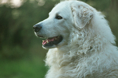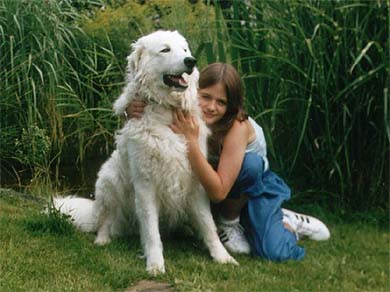 Ihr erlaubt, daß ich mich vorstelle: Mein Name ist Orkan, Orkan-Geri vom Quecksilber. Nachdem nun ein Teil meiner Verwandtschaft von ihren Besitzern vorgestellt wurde, möchte ich mich mal selbst zu Wort melden. Geboren bin ich in der Eifel bei Mariette und Stephan. Natürlich war ich Stephans Liebling. Daran erinnere ich mich gut und freue mich heute noch tierisch, wenn wir uns wiedersehen. Obwohl er mich noch immer "Männlein" nennt, wo ich doch längst erwachsen bin. Eltern... Meine neue Familie hat mich mehrmals besucht, ehe ich mit 12 Wochen mit ihnen gefahren bin. Ich muß zugeben, ich habe es glänzend getroffen. Schönes Haus, großer Garten, fast täglich lange Spaziergänge, sympathische Verwandtschaft. Na ja, bis auf Nachbars dreibeinige Katze, vielleicht. Aber ganz ehrlich, wenn ihr sehen könntet, wie provozierend sie auf der Fensterbank thront, ihr würdet verstehen, was ich meine. Ihr Mitbewohner ist da anders. Mit Alfons, dem Cockerspaniel, kann man wunderbar spielen und toben. An sich bin ich ein ordentlicher Kuvasz, pflichtbewußt, territorial und wachsam. Meine kleine Freundin Tamara allerdings - meine Leute nennen sie "ihre Nichte" - ist mir jederzeit und überall willkommen. Wenn sie zu Besuch kommt, schläft sie selbstverständlich in meinem Zimmer. Na ja, wie sonst sollte ich nachts neben ihrem Bett liegen und über ihren Schlaf wachen? Als ich noch jünger war, bin ich oft mit meinen Leuten auf Ausstellungen gefahren. Das war eine Art Familientreff und meistens aufregend und amüsant. Aber um der Wahrheit die Ehre zu geben, manchmal wär' ich schon lieber spazieren gegangen. Ich bin ja ein Gemütshund und habe mir nichts anmerken lassen. Aber Im-Kreis-Laufen, wildfremden Menschen meine Zähne zeigen und einiges mehr, wozu, bitte schön, soll das gut sein? Nun ja, Herrchen schien es zu mögen, wenn wir am Schluß wieder mal bei der Nr. 1 standen, und ich hab' ihm die Freude gegönnt. Heute fahren wir zu meiner Zufriedenheit öfter in den Urlaub als auf die Ausstellung. Jeden Tag lange Spaziergänge und Wanderungen, dauernd was Neues zu riechen - einfach nur wunderbar. Jeder hat ja so seine Eigenheiten, und bei aller Bescheidenheit sind wir Kuvaszok schon eine besondere Sorte Hund. Meine persönliche Vorliebe ist es, hin und wieder, wenn alles ruhig ist und schläft, im Hause umherzuwandern und mal im einen, mal im anderen Zimmer das Licht einzuschalten. Unverständlich, aber wahr: Meine Familie weiß mein Hobby nicht zu schätzen. Wenn ihr mich fragt, sie sollten wirklich froh sein, daß ich ungebetene Gäste abschrecke, ohne meine Stimme zu erheben... Trotzdem finden sie, ich sei ein Prachtkerl, und da kann ich nur zustimmen! i.A. Eva Walter, Januar 2003
