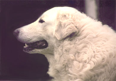 Geboren am 16. Juli 1996, gekörter Zuchtrüde, HD-A, von Lázár vom Quecksilber, mehrfacher Champion, HD-C, und Kátjusá vom Quecksilber, mehrfacher Champion, HD-A. Unser ganzer 0-Wurf ist an Freunde und Bekannte gegangen - bis auf Osiris, genannt Schnürz, der in Dünfus geblieben ist. Er ist der kleinste und schmalste unserer Rüden, und gleichzeitig der temperamentvollste Hund des ganzen Rudels und ein sehr typvoller Kuvasz-Rüde. Schnürz springt aus dem Stand 2 Meter hoch, er ist schnell und außerordentlich wendig, ein spitzbübisches Schlitzohr, charmant bis in die letzte Krallenspitze, immer wachsam, aber ohne alle Aggression. Woher er seine Energie nimmt, ist unerklärlich - unserem Sensibelchen reicht eine Fliege auf dem Freßnapf, um das beste Futter für unappetitlich zu befinden.