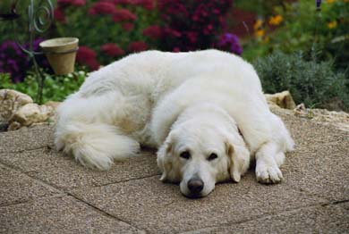 OXANA ... oder auch ... Adel verpflichtet .... nur wozu eigentlich? Oxana erblickte das Licht der Welt am 16. Juli 1996 als einzige Hündin des O-Wurfes. Sie ist gekörte Zuchthündin, HD-A, Internationaler und Luxemburgischer Champion sowie Deutscher Champion, VDH und KfUH, Bundessiegerin 1999. Oxanas Lebensphilosophie: jeden Tag auf's Neue überdenken, wozu soviel ungarischer Adel denn nun verpflichtet. Zumindest wohl, sich das Frühstück allmorgendlich ans Bett reichen zu lassen und Streicheleinheiten fremder Menschen mit einem Gesichtsausdruck zu dulden, der ihren inneren Widerwillen angemessen zum Ausdruck bringt - nicht anders ergeht es fremden Hunden, denen das weiße Fell fehlt. Allerdings - verpflichtet Kuvasz-Adel wirklich dazu, Nachbar's Katze bei passender Gelegenheit in wilder Hatz nachzusetzen? Und sich regelmäßig der Kleidsamkeit brauner Matschstiefel zu vergewissern? Zu übertreffen eigentlich nur noch von der Kombination mit einem Hauch vornehmen Odeurs... Wie wäre es zum Beispiel mit etwas Hühnermist ? Oxanas Wesen besticht durch ihre Gegensätze. Nur in einem Punkt, da gibt es auch nicht die kleinste Andeutung von Konträrem: Oxana ist die Kuvasz-Inkarnation des Wortes "Wesensfestigkeit", was ihrem Gemüt schon Beschreibungen wie "Pflasterstein" oder "Gullideckel" eingetragen hat. Oxana betrachtet ihre Umwelt mit unerschütterlicher, leicht gelangweilter Nonchalance, all dies ohne einen Hauch von Aggression ... Das hat sie schließlich nicht nötig ... Bei soviel ungarischem Adel ... Hartnäckige Stänkerer treffen auf vollkommene Ignoranz. Denn welche vornehme Dame würde sich in Diskussionen mit dem Fußvolk verwickeln lassen? Bettina Dorn, April 2001