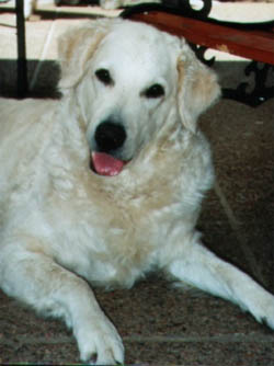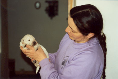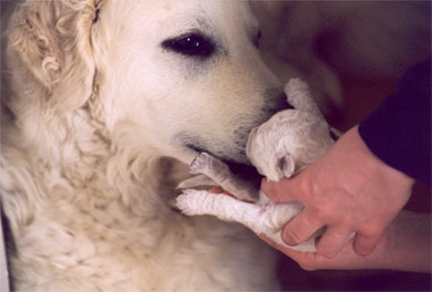 Beide, Nemesis-Jácint und Quadragon vom Quecksilber, sind ausgesprochen typvolle Kuvaszok und sehr pigmentstark. Beide haben ausdrucksvolle tiefdunkelbraune, fast schwarze Augen. Tiefschwarze Lefzen, Nasenspiegel und Augenlider, schwarze Krallen und graue Haut am ganzen Körper. Die Fellstruktur ist ausgezeichnet. Beide Hunde haben wunderschöne Keilköpfe, nahezu ohne Stop. Körperbau und Proportionen sind vorzüglich. Beide verfügen über ein sehr schönes, schnürendes Gangwerk, und die Gliedmaßen sind sehr gut gewinkelt. Nemesis und Quadragon besitzen ein charaktervolles und anschmiegsames Wesen und sind zuverlässige Wachhunde. Beide haben den Verhaltenstest, der ein wichtiger Bestandteil der Zuchtzulassung beim Klub für Ungarische Hirtenhunde ist, mit Bravour absolviert! Beide Hunde sind kerngesund; Hüften, Knie und Schultergelenke sind einwandfrei. Diese Verpaarung ist daher äußerst vielversprechend, und unsere Spannung und unsere Vorfreude wachsen mit Püppis zunehmender Leibesfülle täglich! Karfreitag, den 13. April 2001, war es endlich soweit: 8 Welpen, 4 Mädels, 4 Jungens! Die Zeit ist vergangen wie im Flug. Im August hat der letzte Welpe die Reise in seine neue Heimat angetreten. Wir sind sehr froh, daß auch Shalima jetzt ein liebevolles Zuhause gefunden hat und daß alle sich gut eingelebt haben. Jeder einzelne ist uns ans Herz gewachsen, und die Trennung fiel sehr schwer. Gott sei Dank haben wir uns frühzeitig entschieden, die kleine Shadia bei uns zu behalten! |