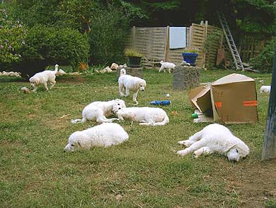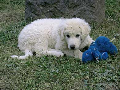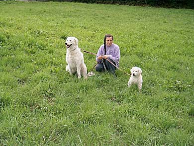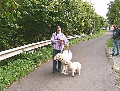 Am Leinchen laufen, das lernen die Kleinen besser noch bei uns. So ein "Strick" um den Hals und dann noch ein zweiter "Strick", der immerhin irgendwann - und zwar ziemlich schnell - zu Ende ist, das müssen die Kleinen nicht unbedingt in Verbindung mit ihren neuen Besitzern bringen. Der Umzug, die neue Familie, die andere Umgebung, das ist Aufregung genug für die jungen Gemüter. Bei den Übungen an der Leine ist deshalb die Mama dabei, die menschliche und die Hundemutter, das gibt Sicherheit. Bei Mama bleibt man ohnehin gern in der Nähe. Ja, nun ist es soweit, nun wird die Hundefamilie langsam kleiner. Tamina hat uns als erste in der 11. Woche verlassen, Ende der Woche wurden Tarik-Idefix und Tarim abgeholt. Eine große Freude für ihre neuen BesitzerInnen, und wir geben ihnen unsere allerbesten Wünsche auf den Weg, den Kleinen und ihren neuen Familien. Wir würden uns freuen, euren Weg weiter begleiten zu dürfen. |
