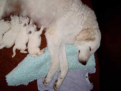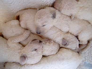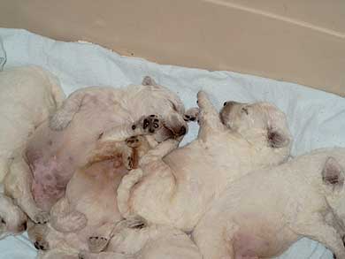 Essen und Schlafen bestimmen in den ersten Wochen den Lebensrhytmus der Welpen und damit auch der beiden Mütter - der vierbeinigen wie der zweibeinigen. Augen und Ohren sind noch geschlossen,zum Schlafen rückt man möglichst eng zueinander, denn natürlich möchten alle schön muckelig warm liegen.