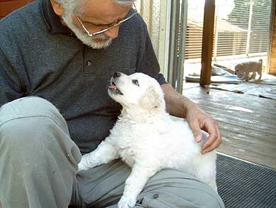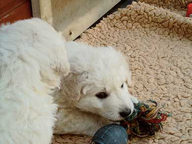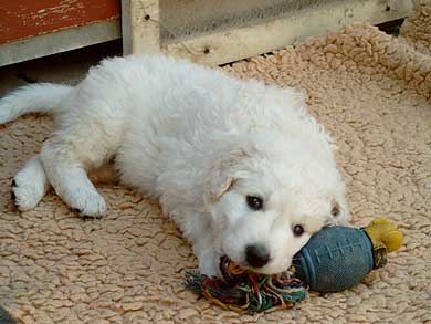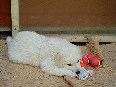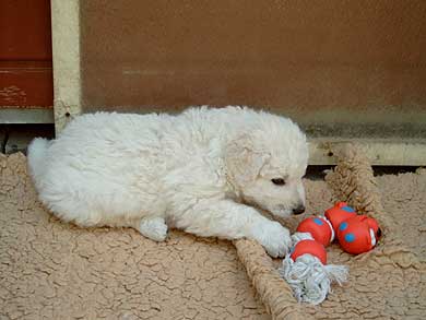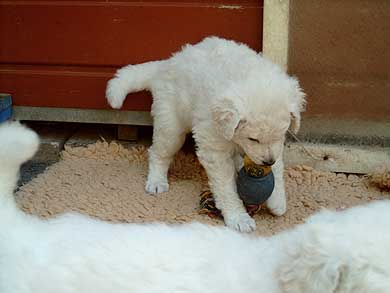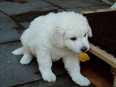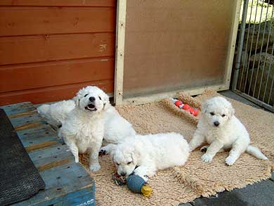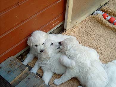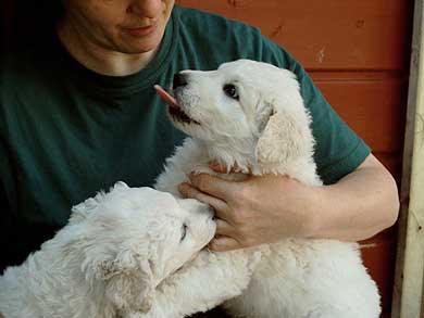 Nicht nur das Spiel mit den Geschwistern, auch der regelmäßige Umgang mit Menschen ist jetzt unersetzlich und prägend für das spätere Sozialverhalten: Von Anfang an muß die Gegenwart von Menschen wie Hunden für die Welpen gleichermaßen selbstverständlich und angenehm sein, eine Grundvoraussetzung, damit sie sich auch als erwachsene Kuvasz einmal entspannt und offen in Gemeinschaft von Mensch und Hund bewegen können. Noch wissen die Kleinen nicht, daß sich ihr kleines neues Universum in den nächsten Wochen weiter und weiter ausdehnen wird. Freunde und Welpenkäufer werden zu Besuch kommen, sie werden Bekanntschaft mit kleinen und großen Hunden anderer Rassen schließen und staubsaugenden Haushaltsungetümen begegnen, sie werden herausfinden, daß die Welt hinter dem Gartenzaun nicht endet und ihre erste Autofahrt unternehmen und, und, und... |