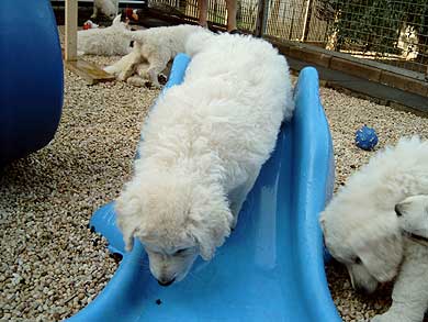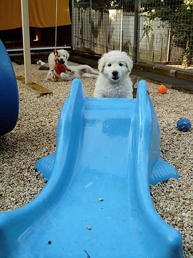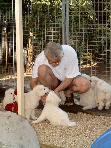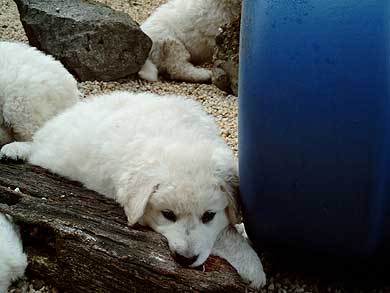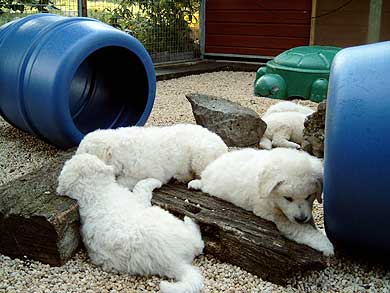 Diese Woche war es unglaublich warm, mit dem heißesten Tag in Deutschland seit Anbeginn der Temperaturmessungen und nicht zum Aushalten, nicht einmal in den schattigen Gartenecken. Überall stehen jetzt Abdeckungen und Sonnensegel, und die Hundemutter kommt regelmäßig mit dem Gartenschlauch und macht alles feucht und kühl. Trotzdem, richtig spielen kann man nur am frühen Morgen oder gegen Abend, wenn es ganz allmählich etwas schattiger wird. Dann wird nachgeholt, was am Tag versäumt wurde. Aufgrund der Hitze gehören Ziegenmilch und Hüttenkäse in diesen Tagen zu den bevorzugten Mahlzeiten. Natürlich gibt es längst schon Welpenbrei, aber für ein gutes Schlückchen geht man auch gern noch zu Mutter Quillaja. Mit vorgewürgtem Futter trägt Quillaja auch zu den "festen" Mahlzeiten bei. Vor unserem T-Wurf haben wir natürlich schon eine Reihe unterschiedlicher Würfe erlebt. Quillajas Welpen sind noch verschmuster, als wir es bislang schon gewöhnt waren - lauter superliebe Kinder, die immer wieder Kuscheln, Schmusen und auf den Schoß möchten. Zu unserer Freude holt auch der Benjamin der Truppe, der kleine "Idefix", zunehmend auf - unser Idefix ist ein sehr helles Köpfchen und besonders pfiffiges Kerlchen, das in Sachen Lebhaftigkeit von Anfang an mit seinem größten Bruder wetteiferte! |