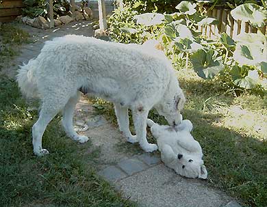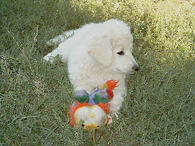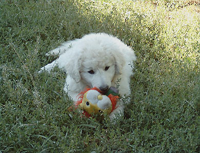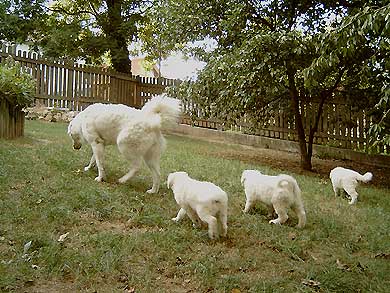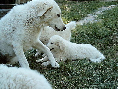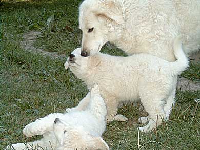 Immer hinterher! Quilli unterwegs mit ihren Kleinen, die inzwischen auch ihre Namen bekommen haben: Für Tavasz-Omar, einen, wenn nicht den hübschesten Rüden von unserer Quillaja, suchen wir noch eine liebevolle Familie. Tavasz ist ein kleiner und intelligenter Vorwitzling - kein Besuch, der sich in Welpennähe niederläßt, ist vor ihm sicher, Tavasz gelingt es nahezu immer, als erster auf dem Schoß zu sitzen! Nachtrag - Gute Nachricht: Tavasz-Omar hat bei Roswitha Schneider ein gutes Zuhause gefunden! In deutschen Landen bleiben Topas (Michael Trunk), Tarik-Idevix (Bettina Vogt), Tamina (Beate Günther), Taika (Familie Drochner), Tarika (Jenny Krause) und schließlich die kleine Tifarah, die bei uns in der Eifel bleiben wird. Tigris-Omar und Tamaris (Schweden) werden in den hohen Norden reisen, unser Tamir findet seine neue Heimat und Familie in Slovenien. |