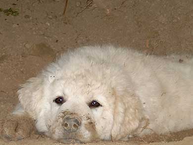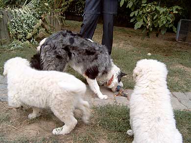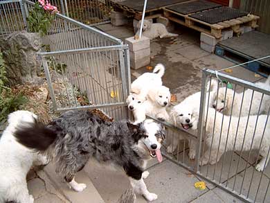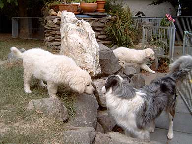Aufruhr im "Welpenstall": Besuch der Borders von nebenan... Nicht alle Hunde sind klein und weiß, wie die Geschwister, oder groß und weiß, wie Mama, Onkel und Tanten. Na, das ist doch mal eine gelungene Überraschung, wer hätte das gedacht...? Aber ganz im Ernst: Kuvasz-Kinder sollten frühzeitig lernen, daß nicht alle Hunde aussehen wie die eigene Familie, sondern auch scheckig oder dunkel sein können, klein oder mittelgroß oder sogar größer als die Verwandschaft, und daß sie sich manchmal auch ganz anders verhalten. |